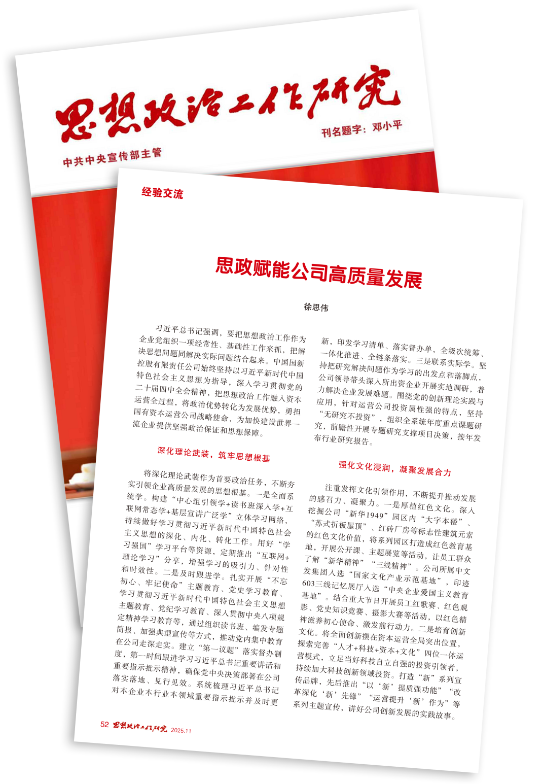 《思想政治工作研究》2025年第11期刊发中国国新党委书记、董事长徐思伟署名文章《思政赋能公司高质量发展》,报道中国国新深入学习贯彻党的二十届四中全会精神,把思想政治工作融入资本运营全过程,将政治优势转化为发展优势,勇担国有资本运营公司战略使命。现将全文分享如下: