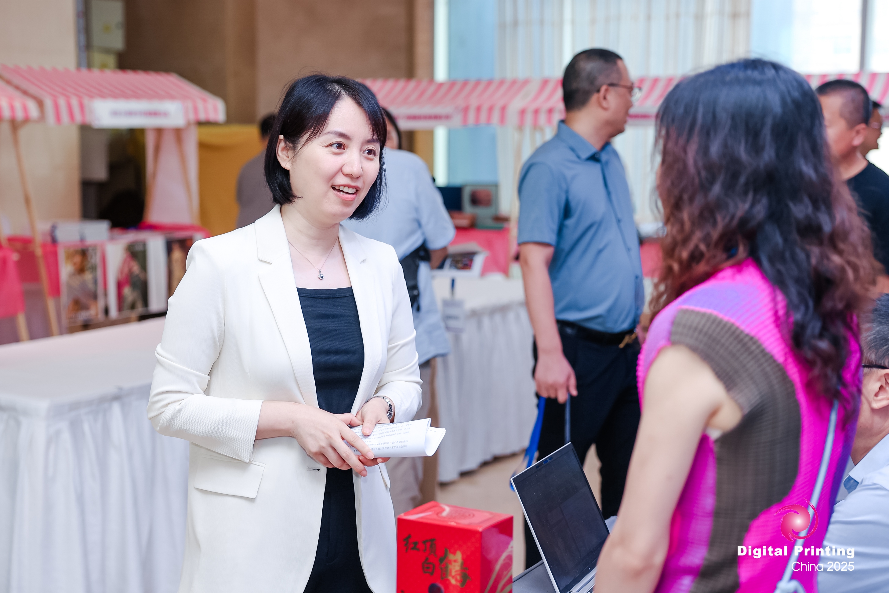 刘轶平(左)在第二十一届“数字印刷在中国”技术发展论坛上与客户交流