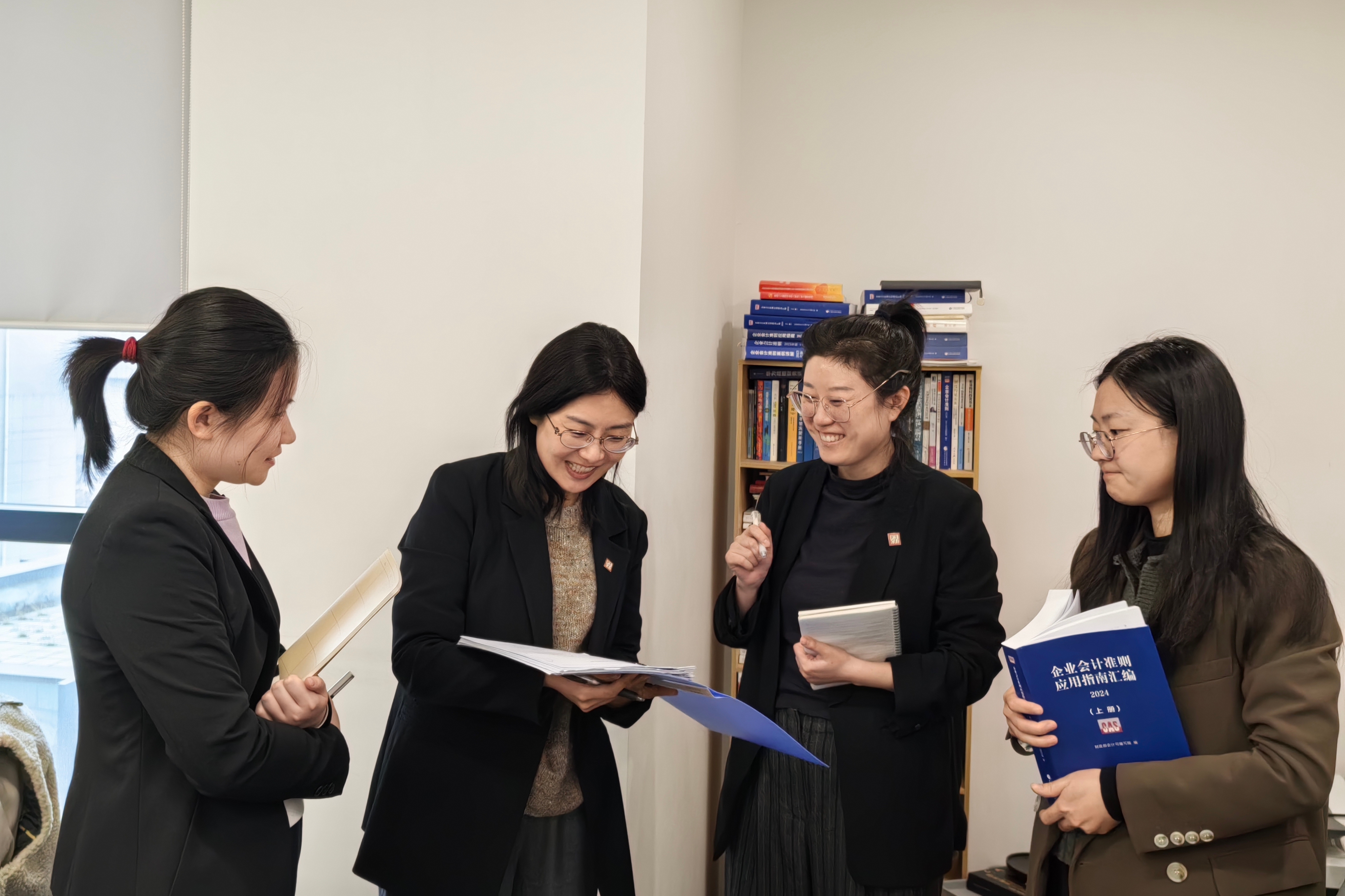 张笑楠(左二)和同事讨论会计准则的实践应用