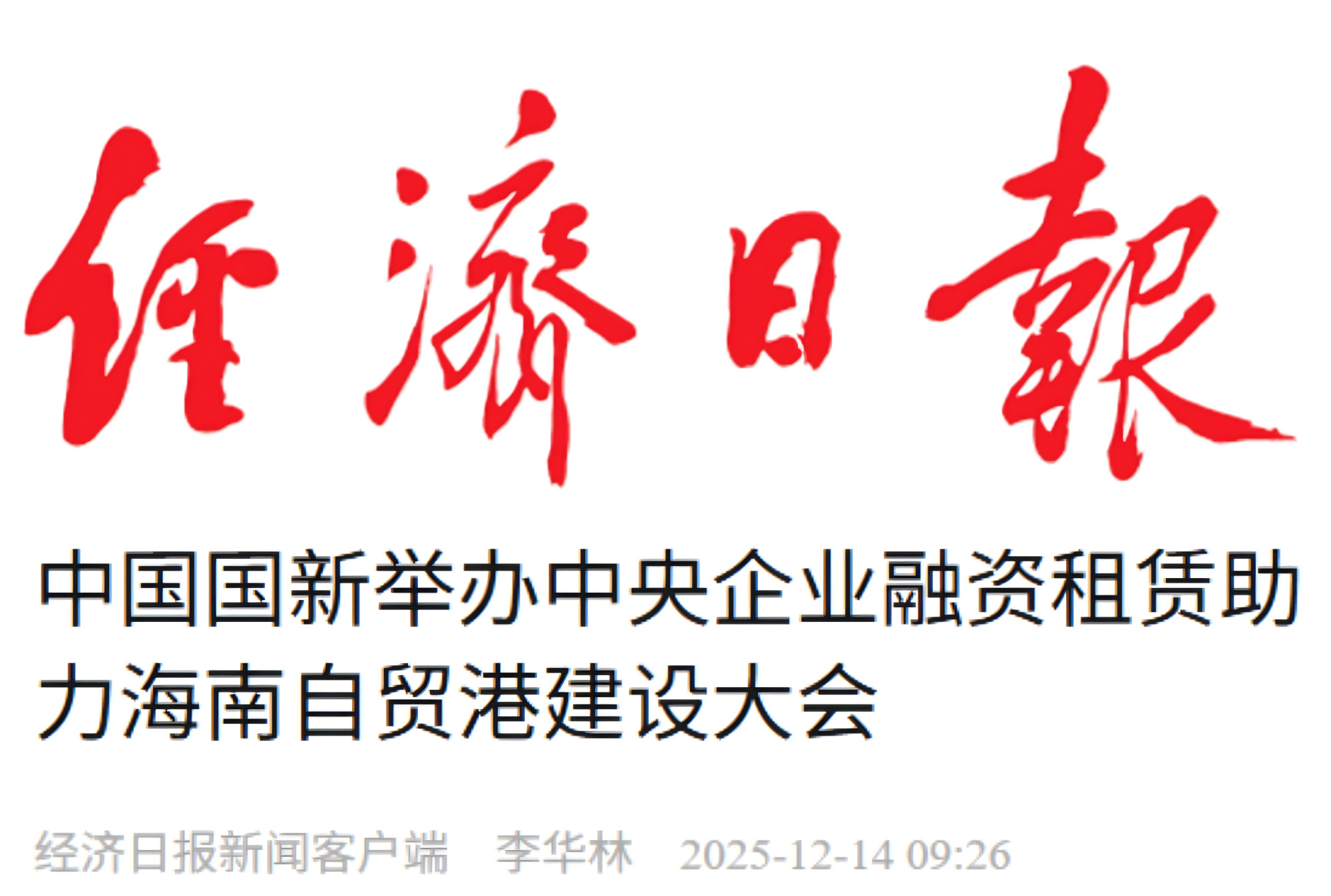 今天,推出系列报道第3期:经济日报推出的《中国国新举办中央企业融资租赁助力海南自贸港建设大会》