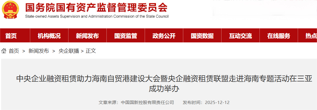 今天,推出系列报道第11期:国务院国资委网站推出的《中央企业融资租赁助力海南自贸港建设大会暨央企融资租赁联盟走进海南专题活动在三亚成功举办》。