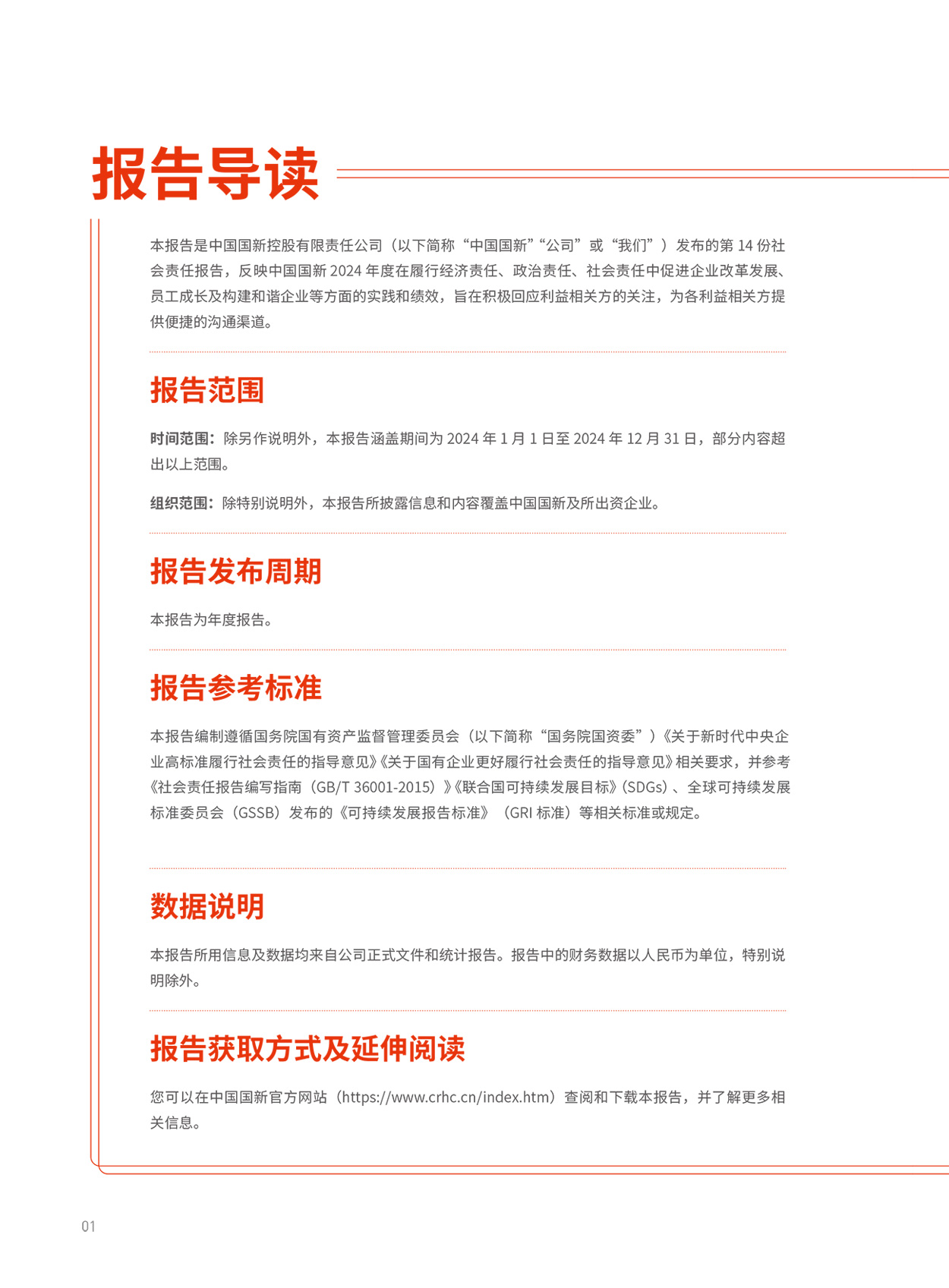 本报告是中国国新控股有限责任公司发布的第14份社会责任报告,反映中国国新2024年度在履行经济责任、政治责任、社会责任中促进企业改革发展、员工成长及构建和谐企业等方面的实践和绩效,旨在积极回应利益相关方的关注,为各利益相关方提供便捷的沟通渠道。