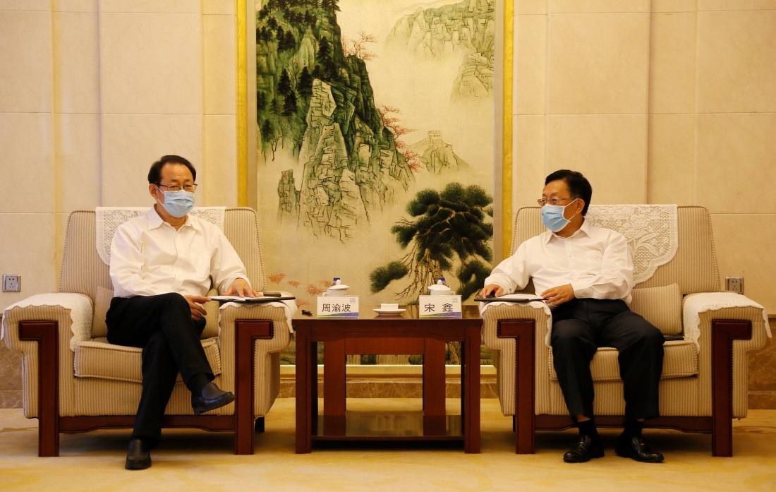 6月24日下午,中国国新党委书记、董事长周渝波带队拜访中国节能,与中国节能党委书记、董事长宋鑫举行会谈。中国国新党委委员、总会计师刘学诗,党委委员、副总经理、总法律顾问王豹,中国节能党委副书记、总经理余红辉,党委常委、总会计师解国光,副总经理朱庆锋参加了会见。