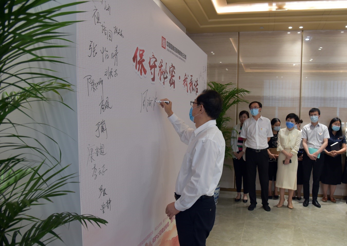 7月13日,中国国新2020年“保密宣传教育周”活动正式拉开序幕。中国国新党委书记、董事长周渝波来到公司一层保密宣传活动展示区,详细了解“保密宣传教育周”工作安排,观看了保密知识展板和保密宣传视频,并在保密承诺墙签字承诺。中国国新党委副书记、总经理莫德旺参加了活动。