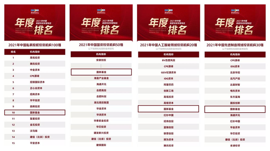10月22日,清科研究中心发布2021中国股权投资年度排名,国新基金荣膺“2021年中国私募股权投资机构100强”第10名,并入选“2021年中国国资投资机构50强”“2021年中国人工智能领域投资机构20强”“2021年中国先进制造领域投资机构30强”多个奖项。