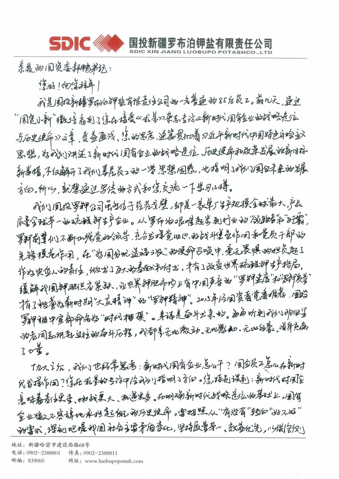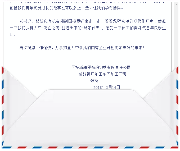 这封写给郝鹏书记的信,来自国投新疆罗布泊钾盐有限责任公司硫酸钾厂加工车间加工三班的一位普通青年员工。
