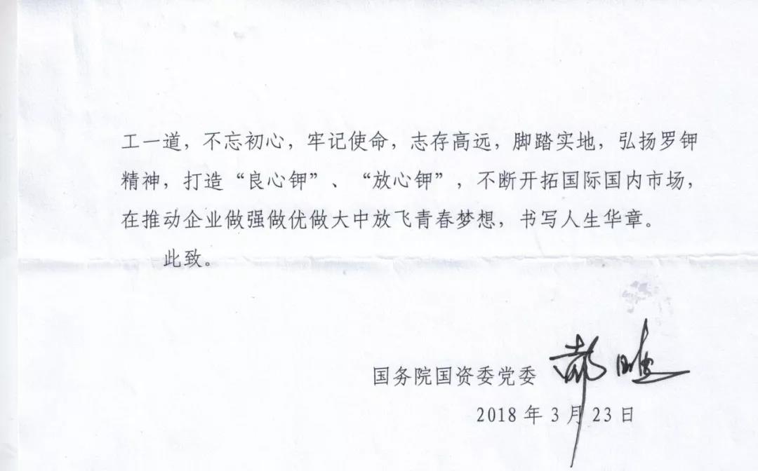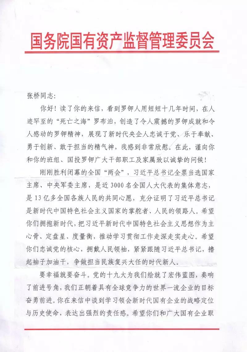 郝鹏书记收到这封千里之外的基层青年的来信后,在百忙之中亲自写了回信。郝鹏书记在回信中对罗钾人在罗布泊创造的成就、罗钾人身上展现出来的新时代央企人的精气神感到非常欣慰,并向广大一线干部职工表达了衷心的祝贺和美好的祝福。