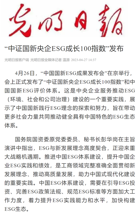 4月26日下午,“中国国新ESG成果发布会”在京举行。多家主流媒体纷纷聚焦会上发布的“中证国新央企ESG成长100指数”和中国国新ESG评价体系。4月27日,《光明日报》刊载《“中证国新央企ESG成长100指数”发布》一文,关注中国国新践行ESG理念,带动更多社会力量共同推动健全具有中国特色的ESG生态体系。现为您全文分享如下: