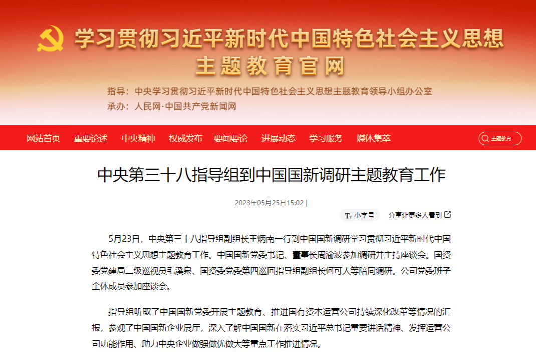 5月25日,学习贯彻习近平新时代中国特色社会主义思想主题教育官方网站报道中央第三十八指导组到中国国新调研主题教育工作。现全文分享如下: