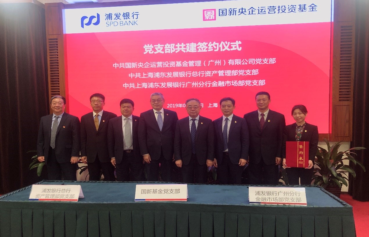 2019年5月11日,央企运营基金管理公司、浦发银行总行资产管理部、浦发银行广州分行金融市场部开展党组织联合共建活动。三方支部书记分别介绍了党建工作经验,并签署了《党组织共联共建协议书》。中国国新党委委员、总会计师、央企运营基金管理公司董事长刘学诗,浦发银行总行党委委员、副行长谢伟,浦发银行广州分行党委书记、行长李荣军,央企运营基金管理公司党支部书记刘隆文,浦发银行总行资产管理部党支部书记蔡涛,广州分行金融市场部党支部书记周玲等出席签约仪式。