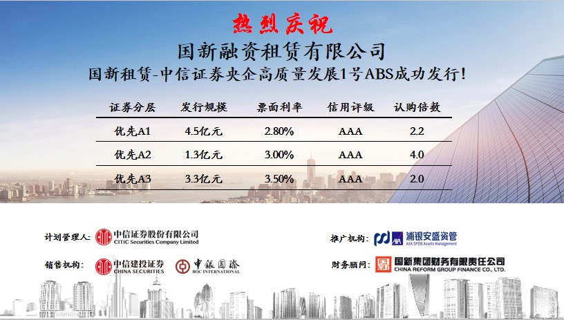 3月24日,国新融资租赁有限公司在深圳证券交易所成功发行 “国新租赁-中信证券央企高质量发展1号资产支持专项计划”,发行金额9.1亿元,分为三层,信用评级均为AAA级,发行利率分别为2.8%、3%、3.5%。该计划为全国首单央企融资租赁合作资产支持专项计划,发行利率为今年以来融资租赁公司ABS发行最低利率。
