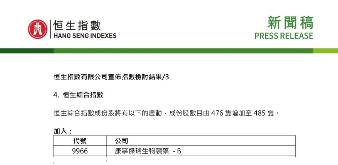 恒生综合指数是香港股市的重要指数之一,反映了公司市值、股票流通量、业务表现及财政状况等各项指标均达到较高水平。康宁杰瑞此次获纳入恒生综合指数,意味着市场进一步认可其的业务表现和未来增长前景。下一步,国风投基金将更好发挥培育孵化功能,推动康宁杰瑞加速成长为有全球竞争力的中国创新生物药企业。